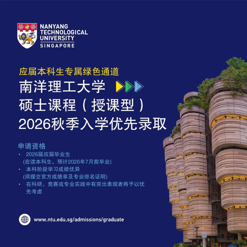 为助力校区优秀应届本科毕业生冲击世界顶尖院校深造机会,现组织新加坡南洋理工大学2026秋季入学硕士(授课型)应届本科生绿色通道报名工作,相关安排如下: